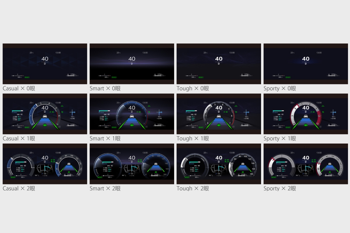 4つのテイスト(Casual/Smart/Tough/Sporty)と3つのレイアウトの中から、好みに合わせて表示を変えられるメーター。マルチインフォメーションディスプレイは、同時に複数の情報が見られるよう、左/中央/右の3種類を表示します。